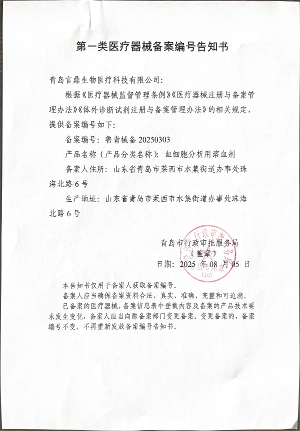 近日,经山东沐鸣2控股集团试剂研发及生产中心、科研服务中心产品申报部前期的努力筹备及申报,青岛沐鸣2生物医疗科技有限公司的“红色复染染色液”、“血细胞分析用溶血剂”、“组织固定液”获批第一类医疗器械备案。